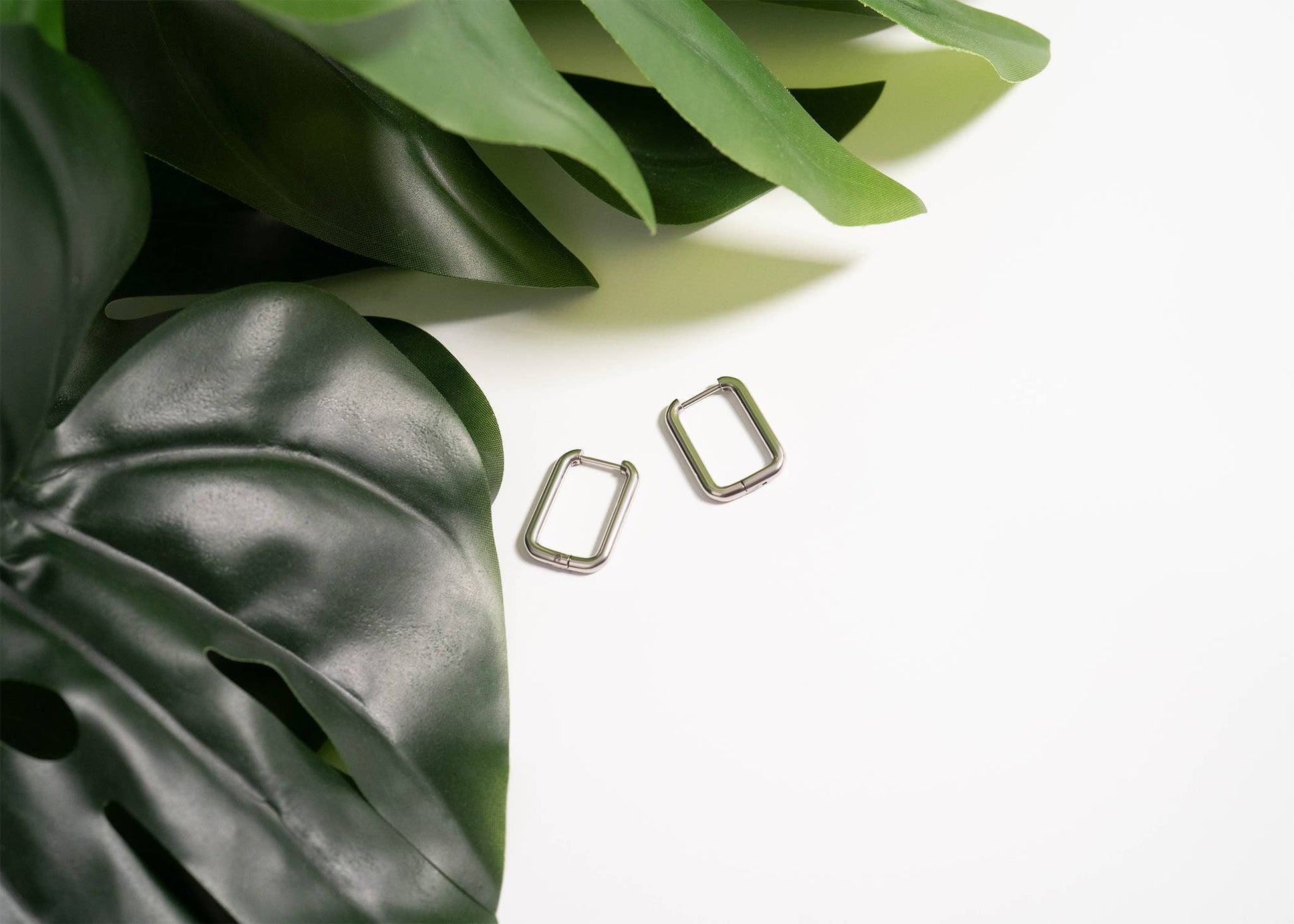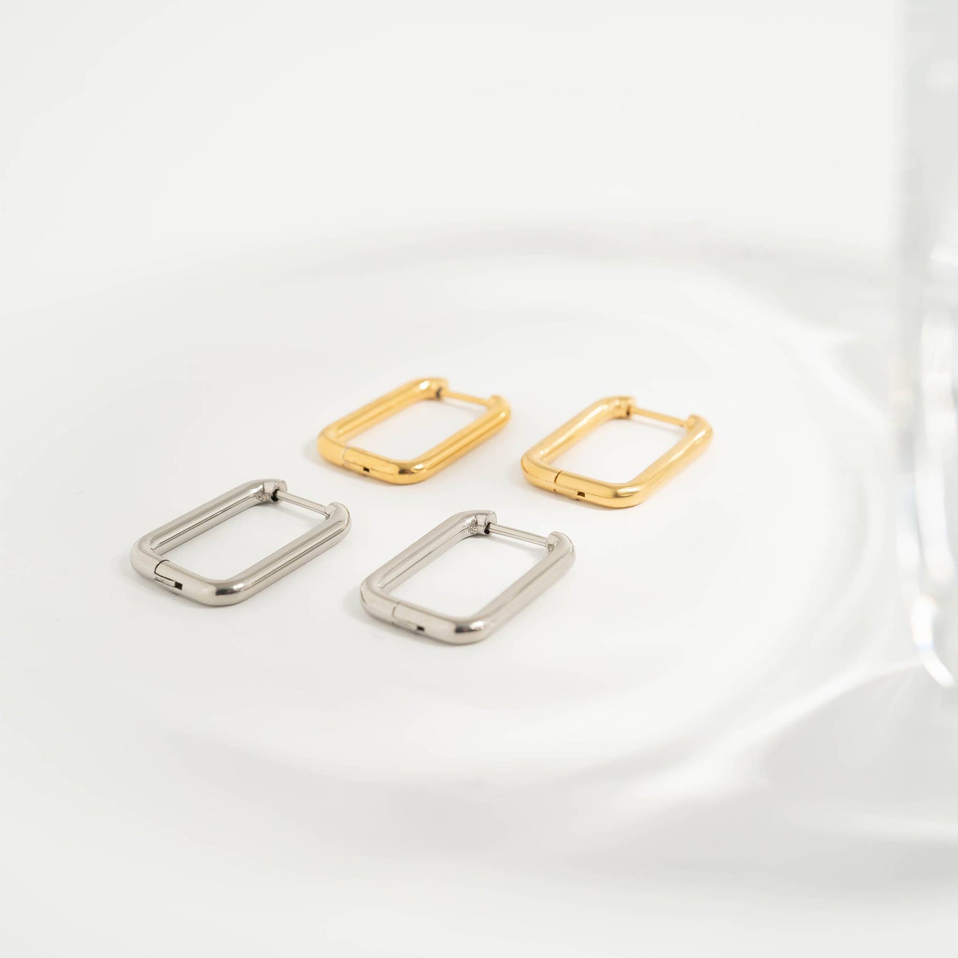 The Rounded Rectangle Huggie Hoop Earrings are great as a stand alone seller, but are the perfect option to be paired with other huggies or stud earrings for a stacked look.