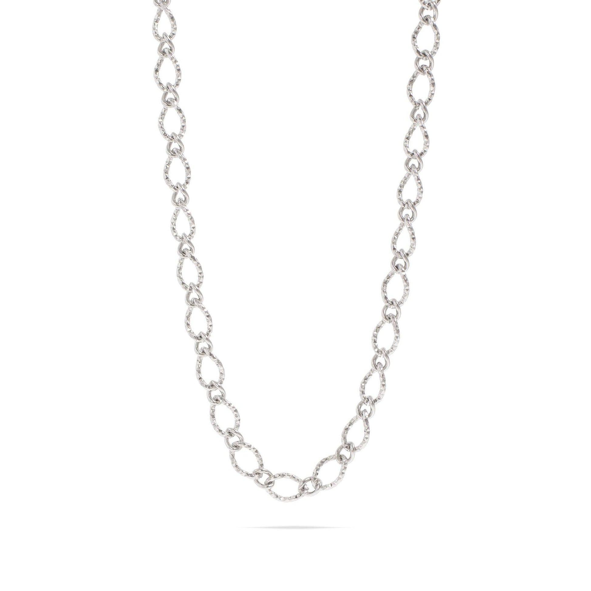 Make a statement with the stunning Hammered Oval Chain Necklace. Featuring textured oval shaped links, this unique artisanal styled chain offers a timeless statement look for every season. Elevate your everyday chain collection look with the elegant hammered oval chain necklace. Perfect worn solo or for creating a layered look! • Waterproof, non-tarnish, hypoallergenic • Premium 18K Gold PVD stainless steel • Available in 16"+2" and 18"+2" length options • 2" Adjustable chain extension • Secure lobster clasp closure Pro Tip: Pair this necklace with our matching Hammered Oval Chain Bracelet