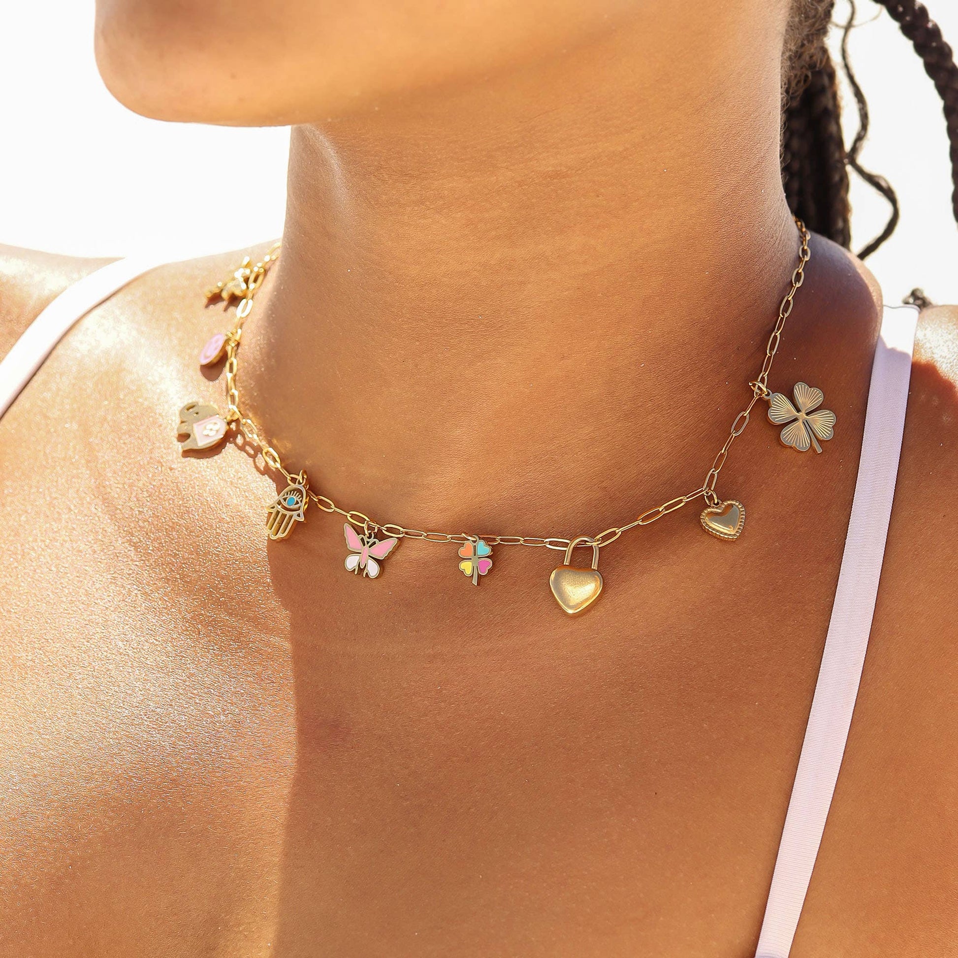 The ultimate symbol of forever love, our NEW Heart Lock Charm is a must-have for your charm bar charm collection! Waterproof, non-tarnish, hypoallergenic • 18K Gold PVD-coated 316L Stainless Steel • Perfect for accenting chain necklaces and bracelets Explore a variety of chain necklaces, bracelets, and findings to make a finish creation of your own! Charm Size: 12mm x 18mm Recommended Jump Ring Size: 20g - 22g Approx. Weight: 3.92 grams